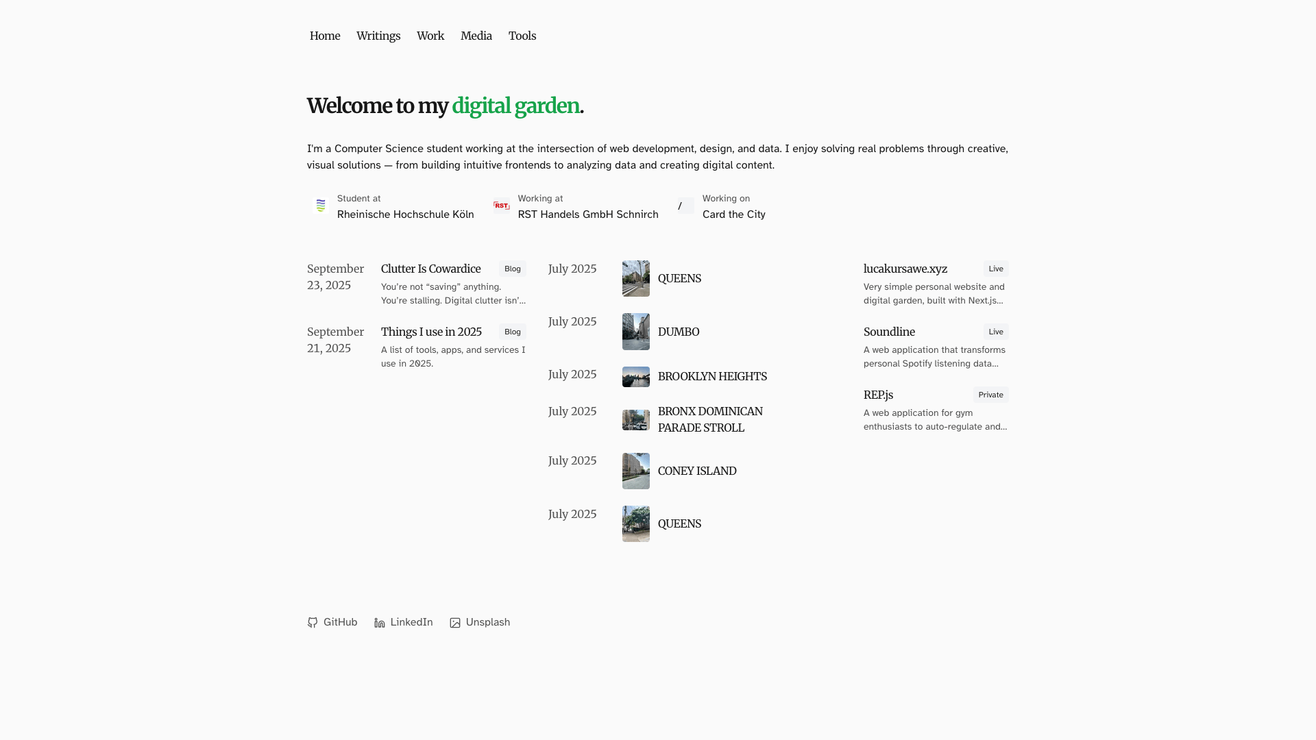 Digital garden concept visualizationSoundline - NYC subway-style music visualizationA view of the Brooklyn Bridge from a park with trees in foregroundRainbow from firehydrant on a sidewalk in Williamsburg BrooklynWilliamsburg street with buildings and traffic lightsView from Brooklyn Bridge onto traffic and buildingsNYPD vehicle parked on a street in BrooklynA red car parked in front of a tall brick buildingA fire hydrant on a sidewalk in Brooklyn a man running in Brooklyn Bridge ParkA view of a main road in Brooklyn with traffic lights and buildingsA tall apartment building in Brooklyn with a blue skyA view of Brooklyn Heights with brownstone building and treesUrban landscape with modern architecture and city skylineStreet photography capturing urban life and movementDetailed architectural elements and modern designUrban exploration capturing hidden city cornersMinimalist composition with clean lines and shadowsUnique perspective and angle in urban photographyStudy of light and shadow in urban environmentFocus on textures and materials in urban settingStudy of reflections in modern architectureHigh contrast composition in urban photographyGeometric patterns and shapes in modern architecture